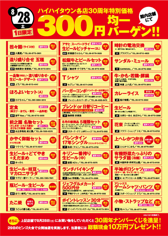 8月28日(土)ハイハイタウン300円均一バーゲン開催!!
